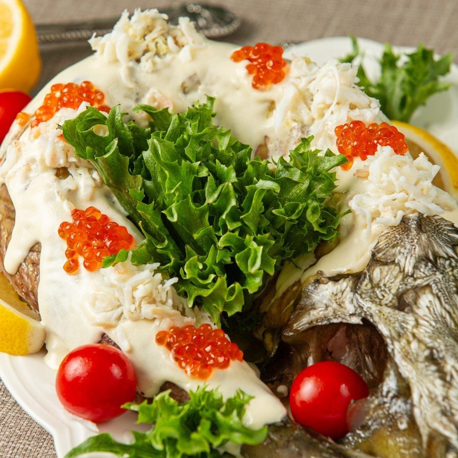 Состав: стерлядь, листья салата, лимон, черри, сливки, огурцы марин, грибы бел. марин, мясо краба, маслины, кетчуп, икра кр, соль