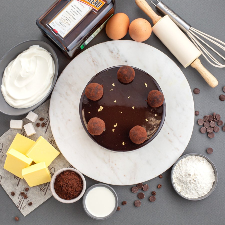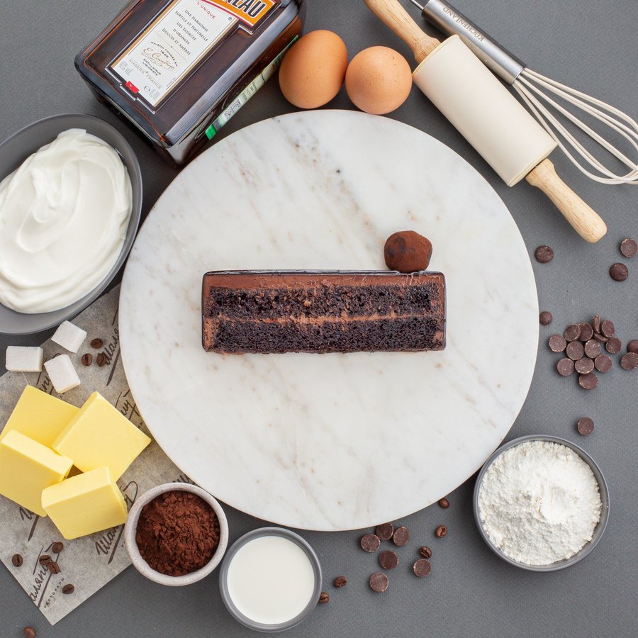 Состав: сливки,шоколад,масло сл,яйцо,сахар,мука пш,сливки,какао порошок,сметана,сироп глюкозы,какао порошок,ликер,желатин,кофе,сода,разрыхлитель..