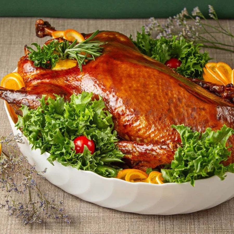 Состав: утка, яблоки, чеснок, соль, зелень, специи; соус: деми гляс, вино, мед; апельсины, черри, листья салата, зелень