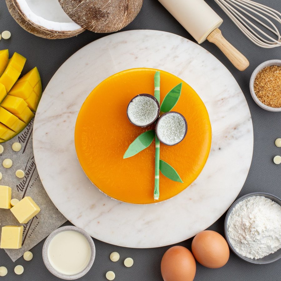 Состав: сливки, сахар, сливки раст, манго с/м, мука пш, пюре манго/маракуйя, глюкоза, гель конд, сахар тр, шоколад, масло сл, масло кокос, желатин, ликер, кокос.стр, мука минд, разрыхлитель